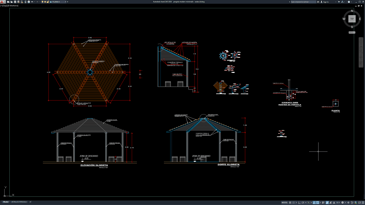 File yang saya bagikan kali ini menyajikan gambar tampak atas, potongan, dan beberapa detail dari pergola depan. Hanya sekedar untuk memberikan referensi pembelajaran ataupun acuan gambar kerja. Ini sangat bagus untuk pemula atau yang baru menekuni bidang arsitektur.