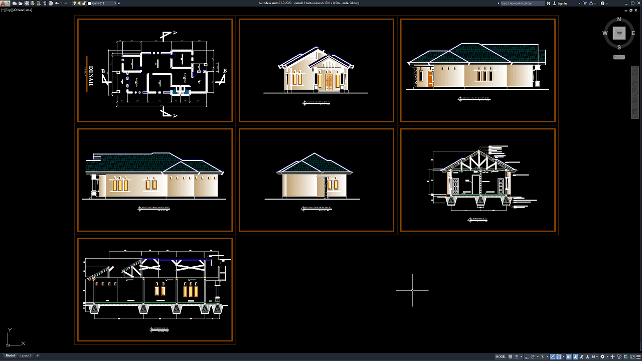 File yang saya bagikan kali ini menyajikan Desain Rumah 1 Lantai Ukuran 17m x 8.5m DWG AutoCAD yang tidak lengkap. Gambar terdiri dari denah, tampak, dan potongan. Silahkan tambahkan sendiri gambar apa saja yang kurang, gambar awalnya sudah ada itung-itung buat belajar mendesain.
