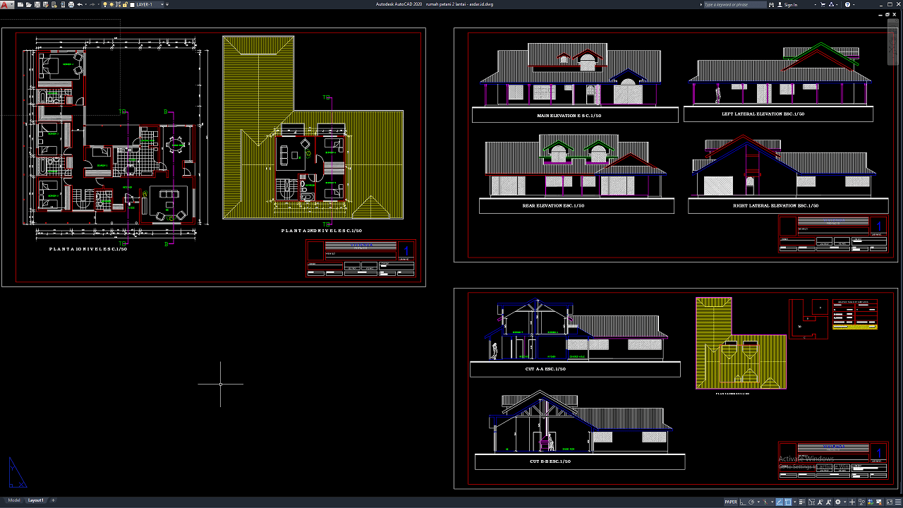 File yang saya bagikan kali ini menyajikan gambar desain rumah pertanian yang lumayan begitu lengkap. Gambar terdiri dari denah, tampak, dan potongan saja. Jadi sangat cocok untuk kalian yang lagi nyari tugas kuliah gambar bangunan 2 lantai. Lumayan kan buat patokan mengerjakan tugas gambar desain.