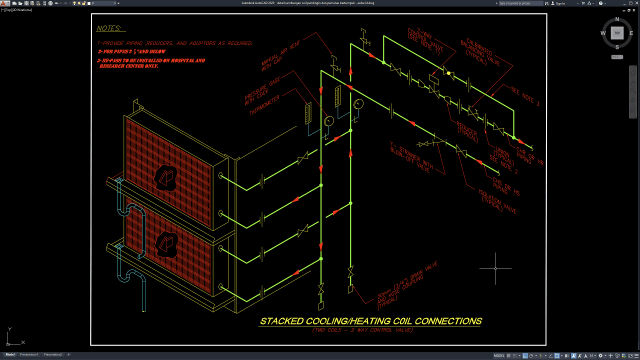 Gambar Detail Sambungan Coil Pendingin dan Pemanas Bertumpuk DWG AutoCAD sangat membantu dalam proses koordinasi desain, pembuatan shop drawing, serta pelaksanaan instalasi di lapangan. Detail yang jelas akan meminimalkan potensi kesalahan pemasangan dan meningkatkan efisiensi sistem HVAC.