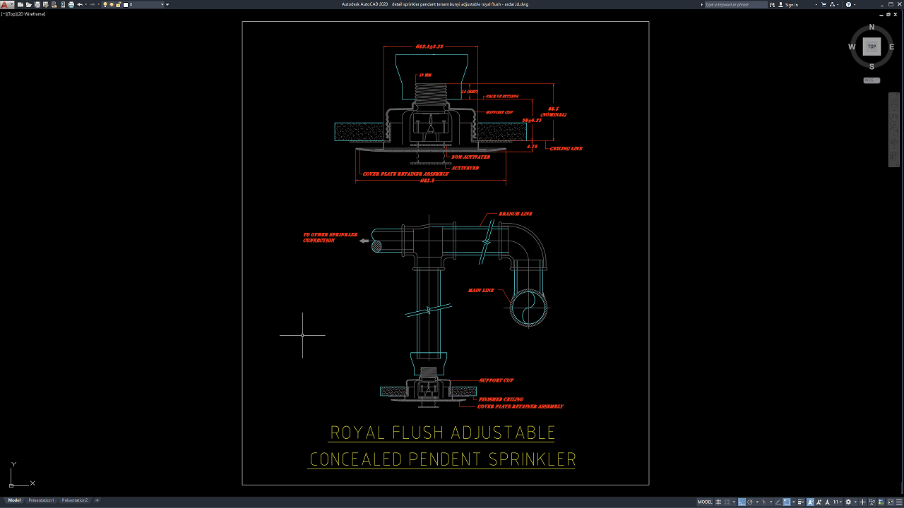 File yang dibagikan berisi gambar detail sprinkler pendant tersembunyi adjustable Royal Flush dalam format .DWG, sehingga dapat langsung dibuka menggunakan AutoCAD versi terbaru maupun versi lama (minimal AutoCAD 2004). File ini dapat diedit dan disesuaikan dengan kebutuhan desain proyek.