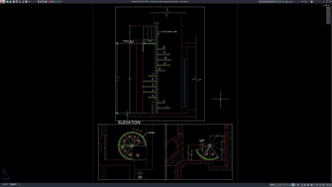 Download Gambar Denah dan Tampak Tangga Baja Helicoidal DWG AutoCAD