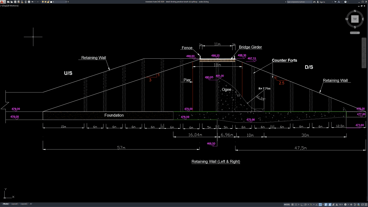 Halo rekan-rekan engineer sipil, drafter, serta praktisi konstruksi yang sedang mengerjakan proyek bendungan, irigasi, maupun infrastruktur sumber daya air. Pada artikel ini saya akan membagikan referensi Gambar Detail Dinding Penahan Tanah Sisi Spillway DWG AutoCAD yang dapat digunakan sebagai acuan dalam penyusunan gambar kerja struktur retaining wall pada area spillway.