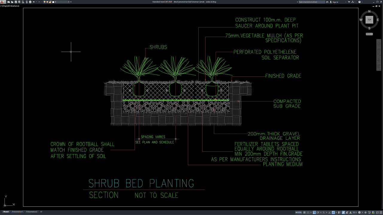 Agar tanaman dapat tumbuh dengan baik serta memiliki tampilan yang estetis, proses penanaman pada shrub bed perlu direncanakan secara tepat. Oleh karena itu, penggunaan gambar detail penanaman menjadi sangat penting sebagai panduan teknis dalam pelaksanaan pekerjaan di lapangan.