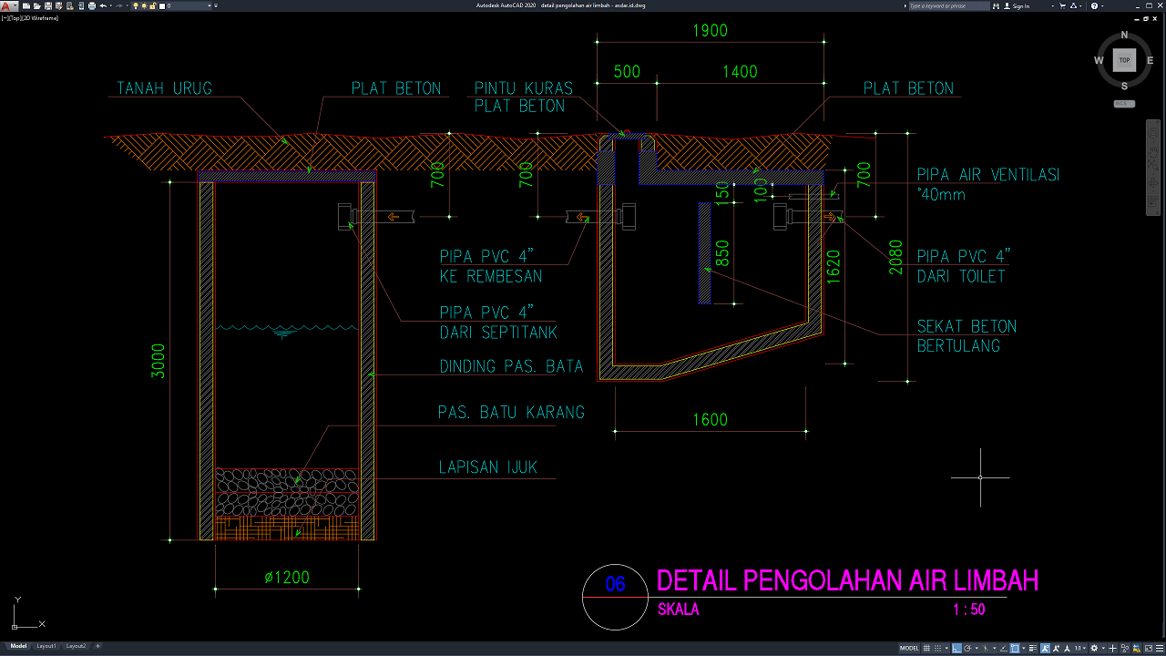 Hanya sekedar untuk memberikan referensi pembelajaran ataupun acuan gambar kerja. Ini sangat bagus untuk pemula atau yang baru menekuni bidang arsitektur maupun civil engineering. Silahkan disesuaikan dengan gambar utamanya jika ingin membuat detail-detail lainnya, tentunya harus memahami dulu detail pengolahan air limbah.