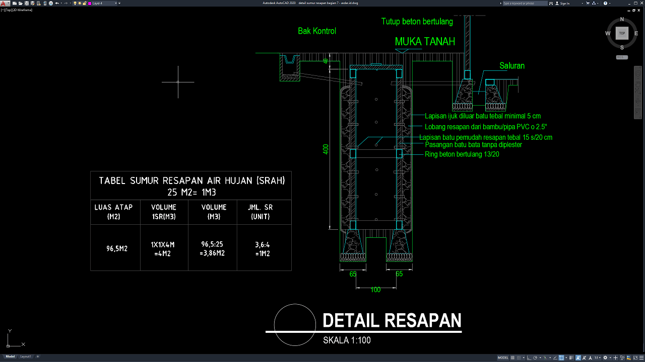 Hanya sekedar untuk memberikan referensi pembelajaran ataupun acuan gambar kerja. Ini sangat bagus untuk pemula atau yang baru menekuni bidang arsitektur maupun civil engineering. Silahkan disesuaikan dengan gambar utamanya jika ingin membuat detail-detail lainnya, tentunya harus memahami dulu detail sumur resapan.