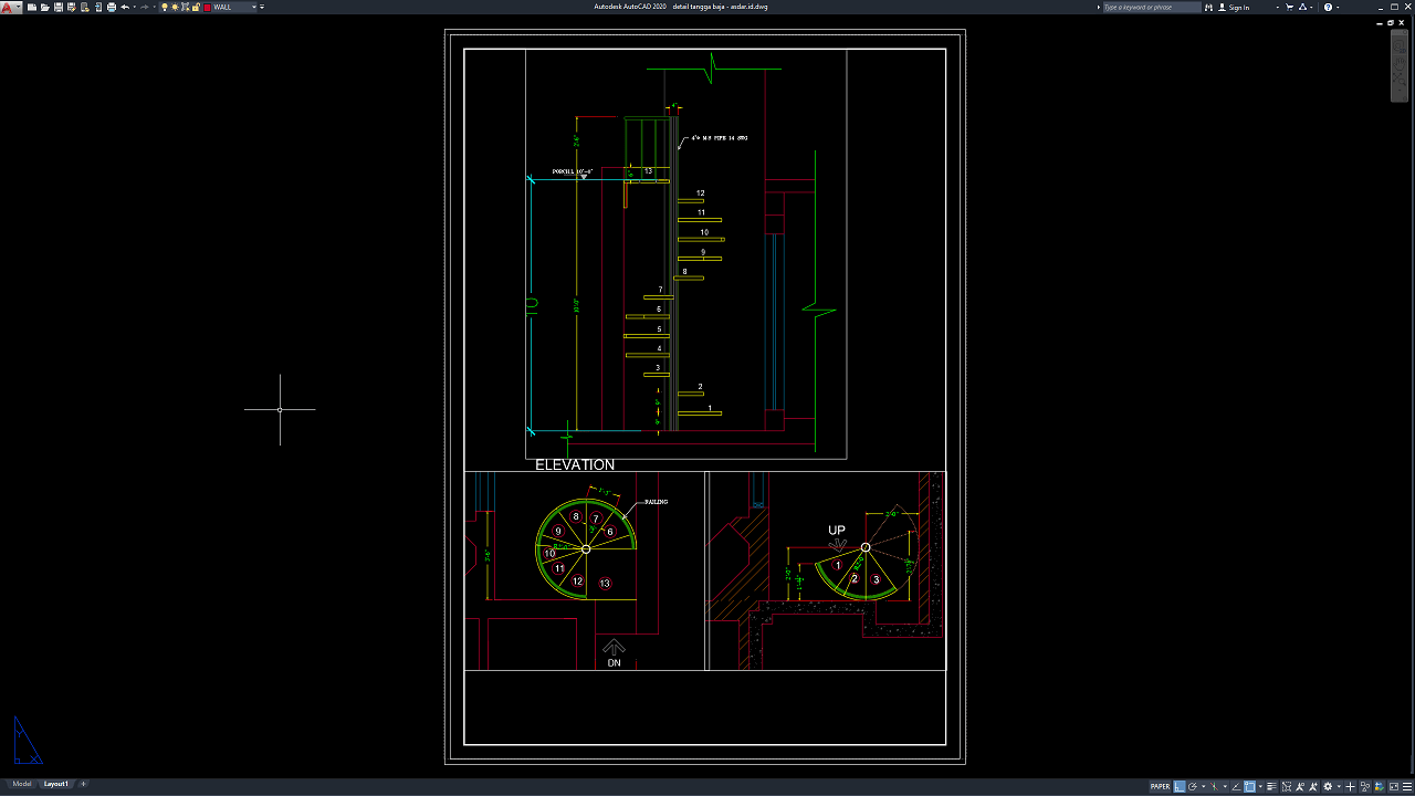 Hanya sekedar untuk memberikan referensi pembelajaran ataupun acuan gambar kerja. Ini sangat bagus untuk pemula atau yang baru menekuni bidang arsitektur maupun civil engineering. Silahkan disesuaikan dengan gambar utamanya jika ingin membuat detail-detail lainnya, tentunya harus memahami dulu detail tangga putar baja.