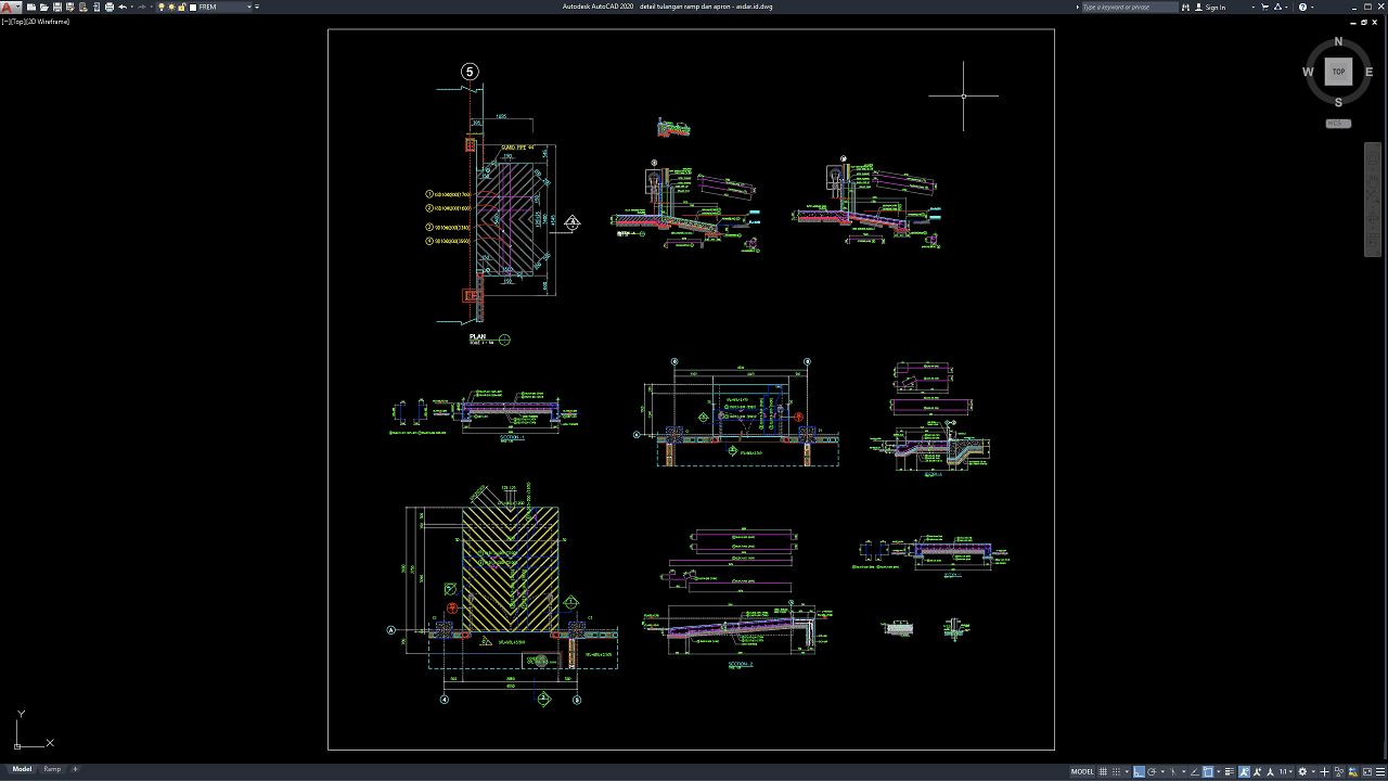 File yang dibagikan pada artikel ini berupa Gambar Detail Tulangan Ramp dan Apron dalam format DWG AutoCAD. Gambar disusun cukup detail dan dapat digunakan sebagai referensi desain maupun acuan awal pembuatan gambar kerja struktur beton bertulang.