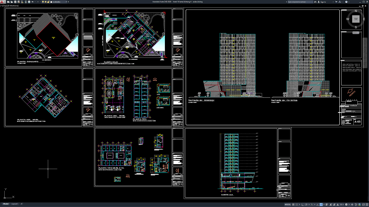 Sesuai judulnya, file yang saya bagikan kali ini merupakan gambar dari hotel 16 lantai dengan pelayanan bintang 4. Gambar terdiri denah, tampak, dan potongan, gambar tidak lengkap karena hanya ditujukan untuk latihan saja. Silahkan bereksperimen membuat gambar lainnya. Keterangan pada gambar ini menggunakan bahasa spanyol, jadi teman-teman harus mentranslatenya terlebih dahulu agar paham.