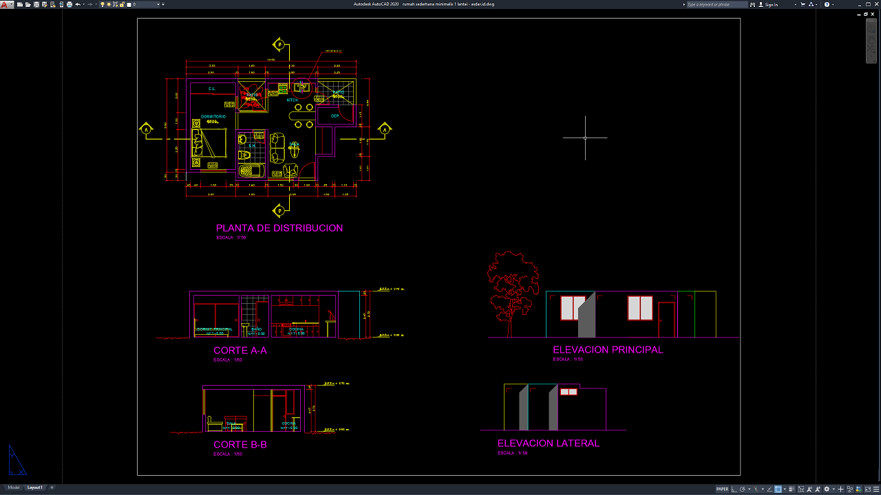 File yang saya bagikan kali ini menyajikan gambar denah, tampak, dan potongan dari rumah sederhana minimalis 1 lantai yang tidak lengkap. Gambar ini hanyalah sebagai pembelajaran saja, namanya juga referensi jadi hanya gambar dasar saja yang disajikan. Silahkan tambahkan sendiri gambar apa saja yang kurang, gambar awalnya sudah ada itung-itung buat belajar mendesain.