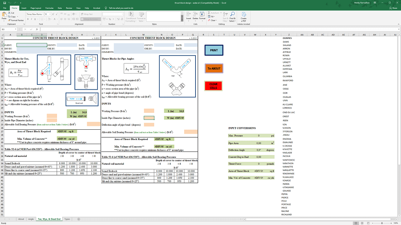 Unduh lembar kerja Excel gratis untuk menghitung dan merancang thrust block pada pipa. Thrust block umumnya digunakan untuk menahan dan menambatkan pipa agar tidak bergeser saat tekanan bekerja di dalam pipa. Perhitungan ini bertujuan untuk menentukan ukuran thrust block yang diperlukan pada pipa yang mengalami tekanan internal, terutama pada bagian sambungan seperti belokan (bend), tee, atau fitting lainnya.