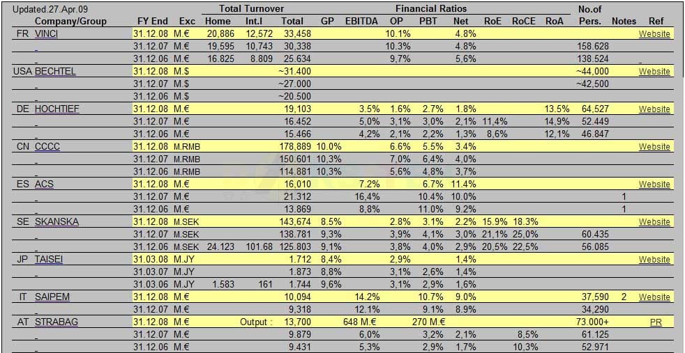 Nilai penjualan pada tahun 2009 VINCI sebesar 33.458 Milyard Euro (418 Trilyun), BECHTEL sebesar 31.400 Milyard Euro (393 Trilyun ), dan HOCHTIEF sebesar 19.103 Milyard Euro (239 Trilyun). Nilai tersebut cukup jauh dibandingkan nilai penjualan tiga perusahaan konstruksi terbesar Indonesia yaitu Adhi Karya (7,7 trilyun – 2009), Wijaya Karya (6,6 trilyun-2009), dan PT. PP (4,4 Trilyun-2010). Pun jika dibandingkan dengan perusahaan raksasa Indonesia yaitu PT. Telkom (68,6 trilyun-2010), dan PT. Astra Internasional (130 trilyun-2010).