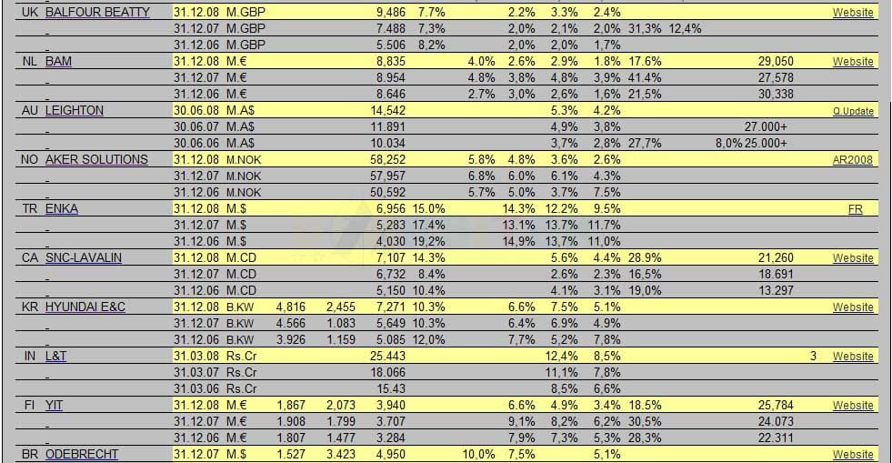 Lalu ada baiknya kita juga lihat performance perusahaan-perusahaan konstruksi terkemuka dunia pada tabel berikut ini.